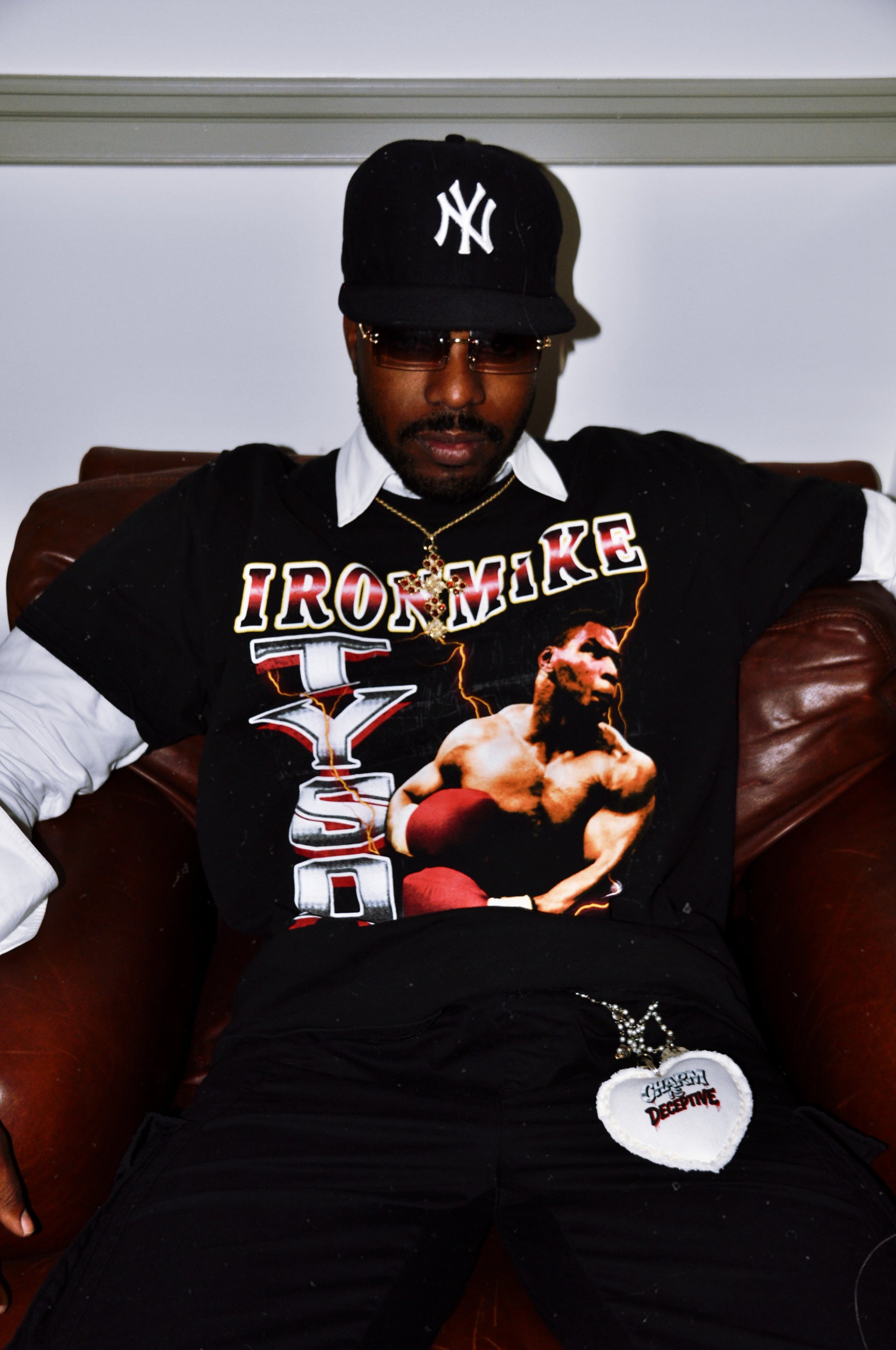 Material: Ivory denim fabric with beige stitch and Charm is Deceptive graffiti. Silver metal ring with a claw clip.