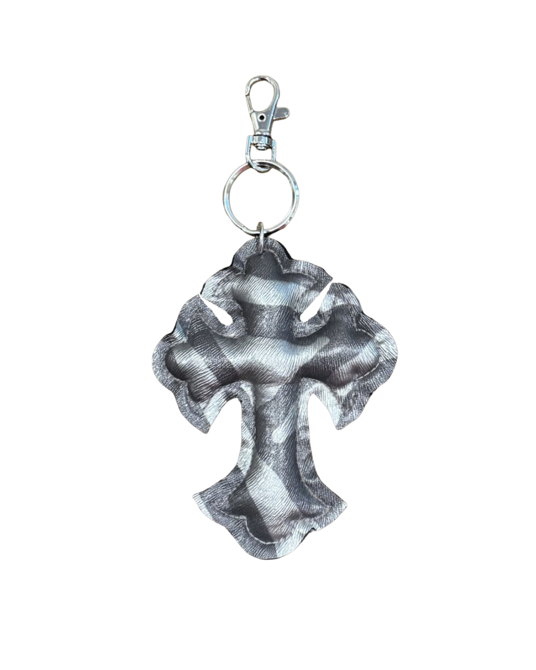 A cross cut from cruelty-free zebra vegan leather — symbolizing the covering of Christ and the uniqueness of every soul redeemed by His stripes.