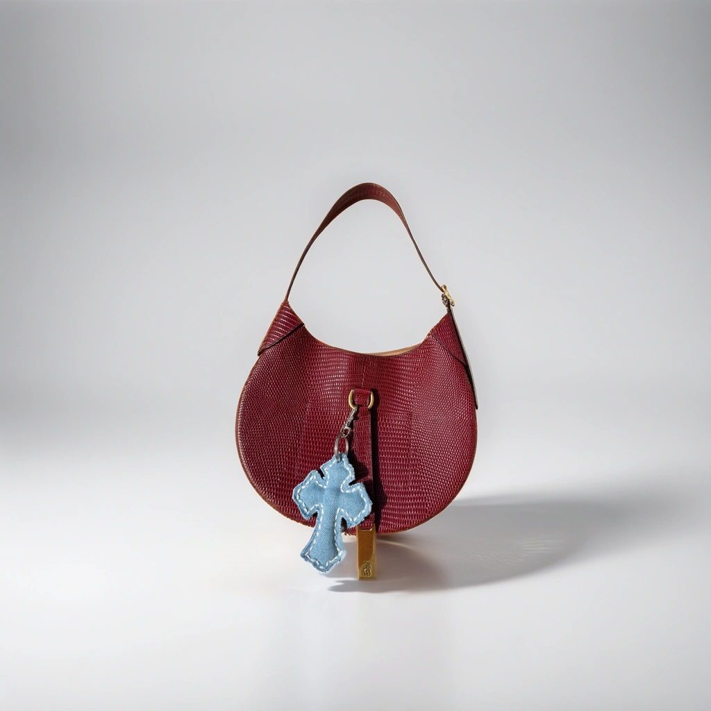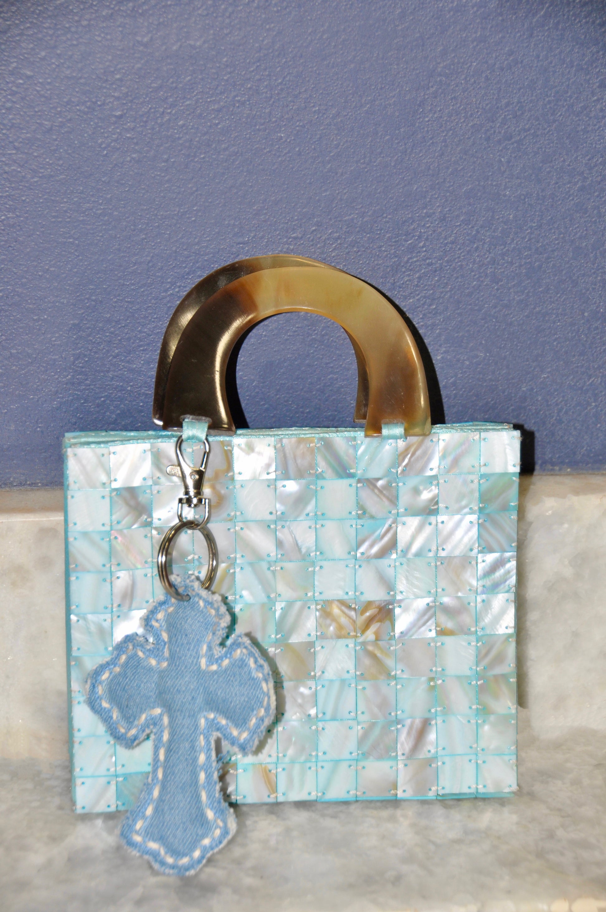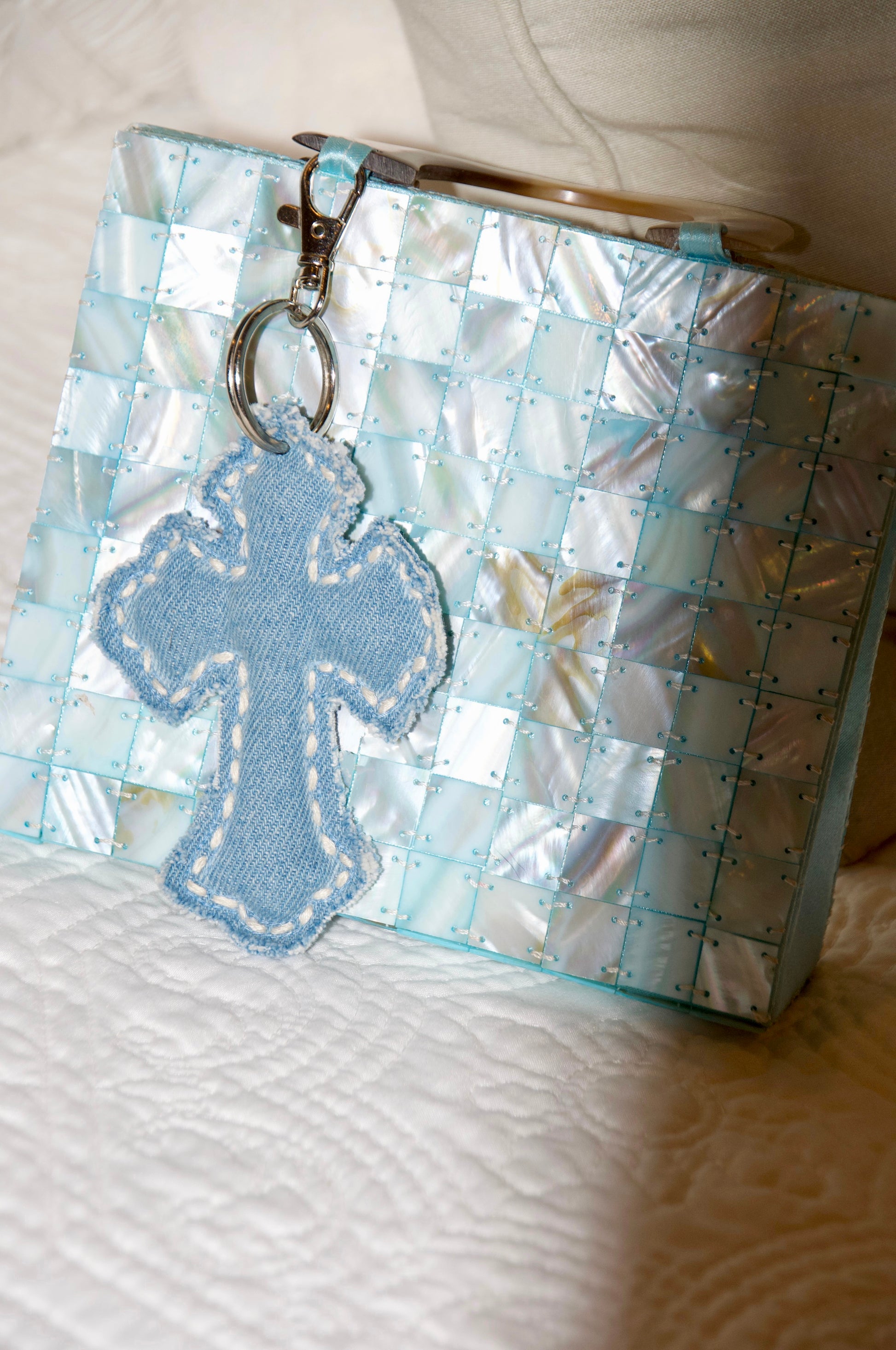 Material: Blue denim fabric with indigo stitching. Silver metal ring with a claw clip.