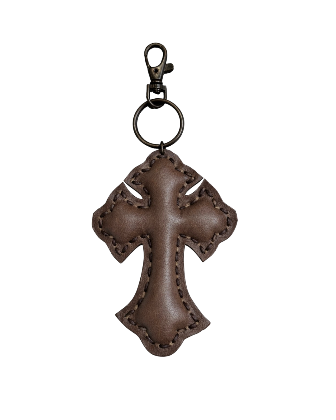Material: Leather brown cross with bronze metal ring and claw clip.