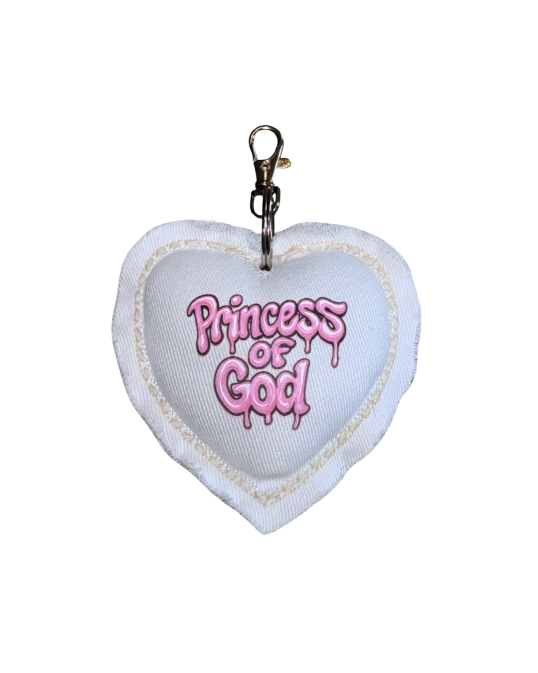 Material: Premium denim fabric with matching stitch and custom “Princess of God” graffiti. Silver metal ring with claw clip.