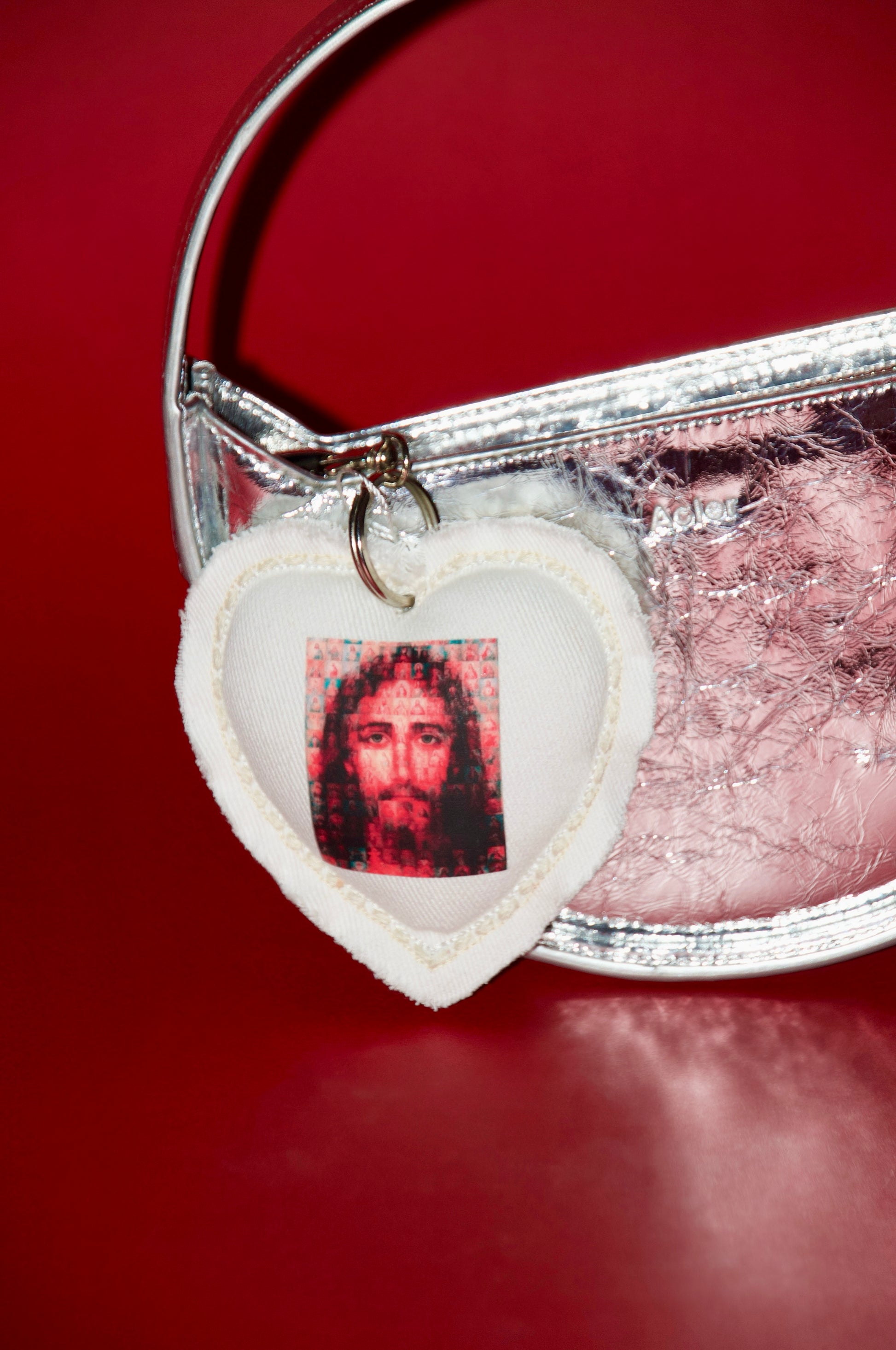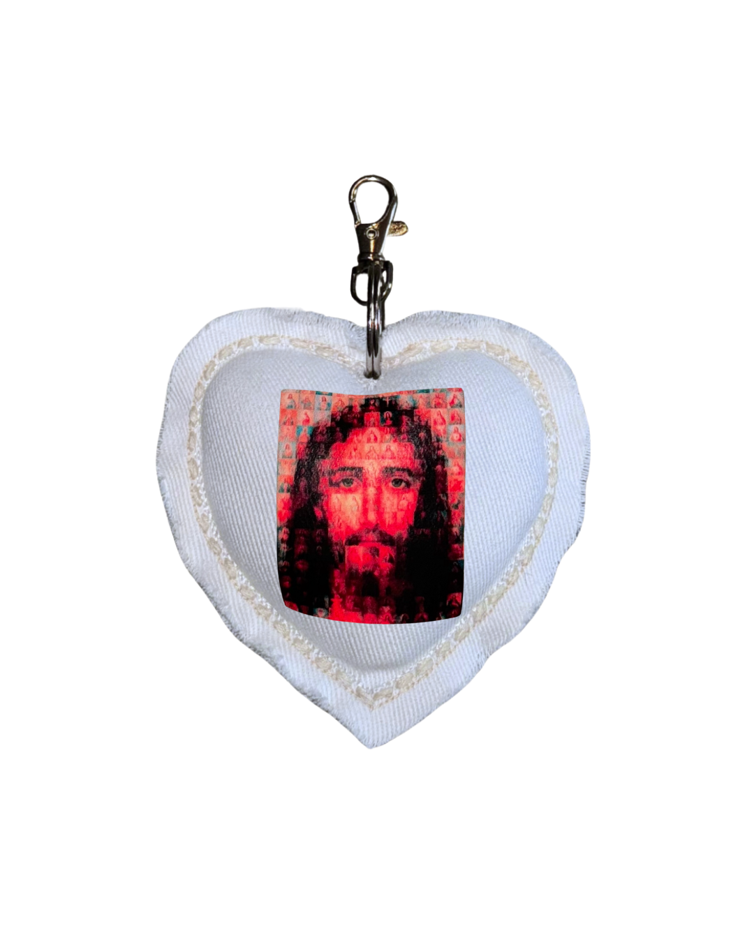 Material: Ivory denim fabric with beige stitch with the face of Jesus. Silver metal ring with a claw clip.