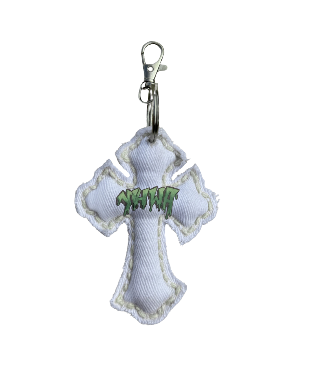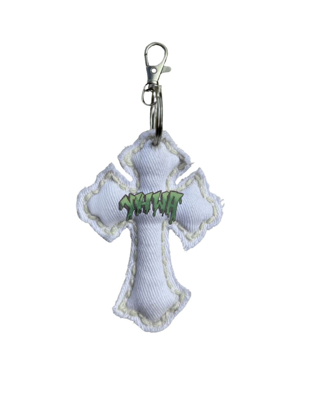 Material: Ivory denim fabric with beige stitching and green ombré YHWH graffiti. Silver metal ring with a claw clip.